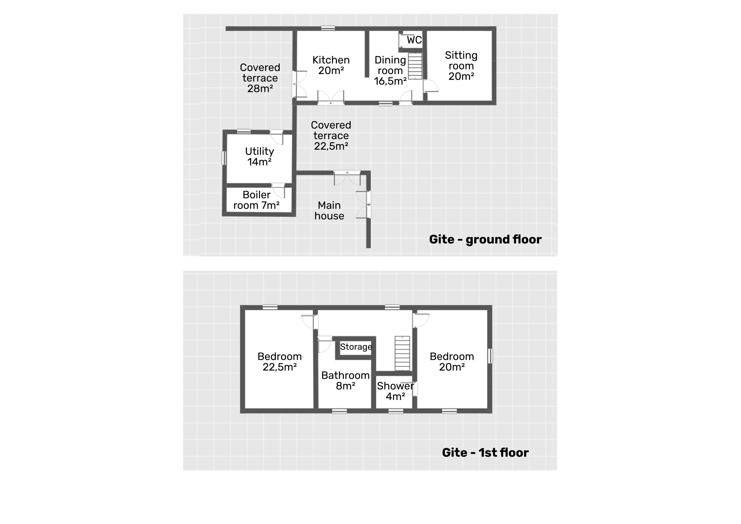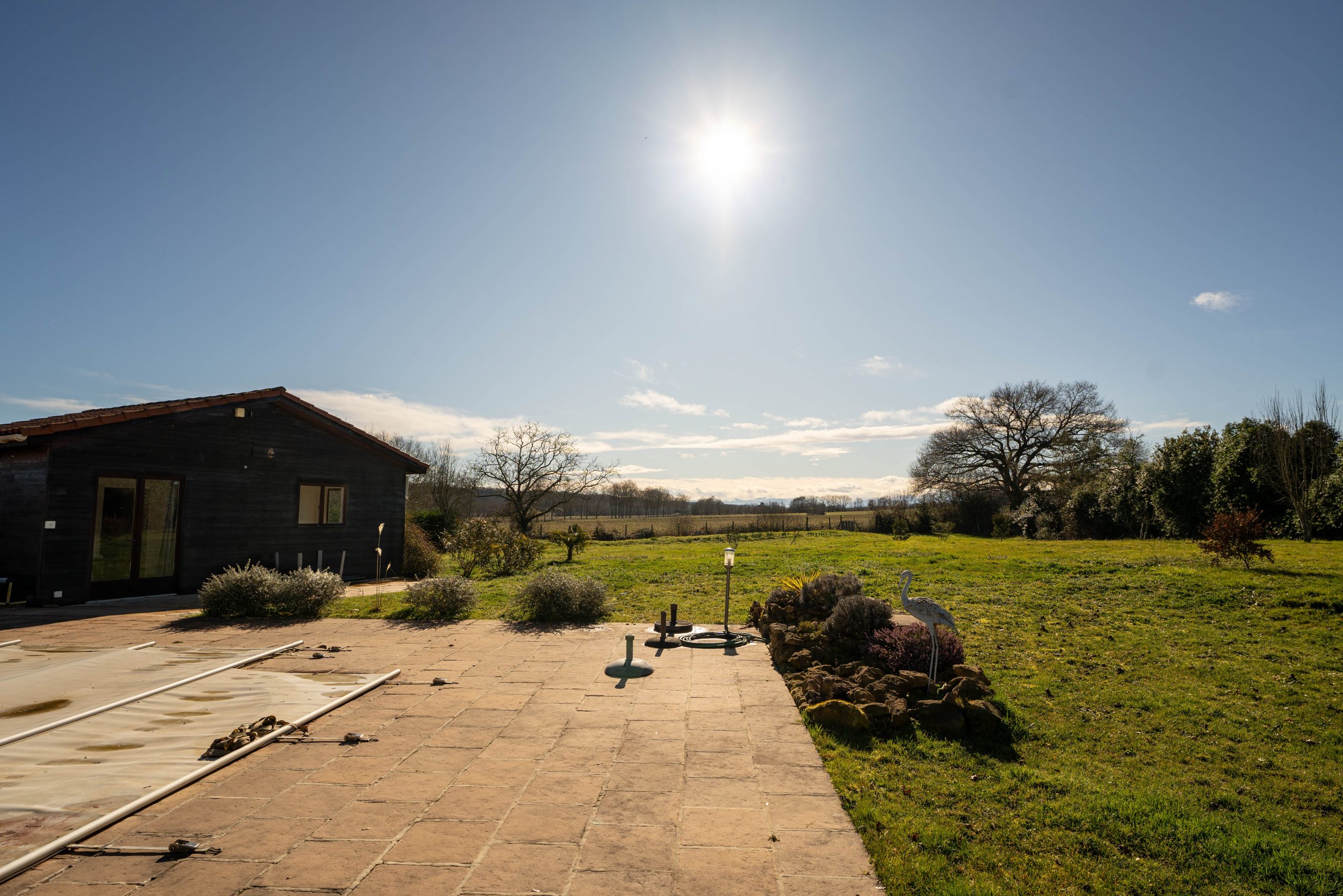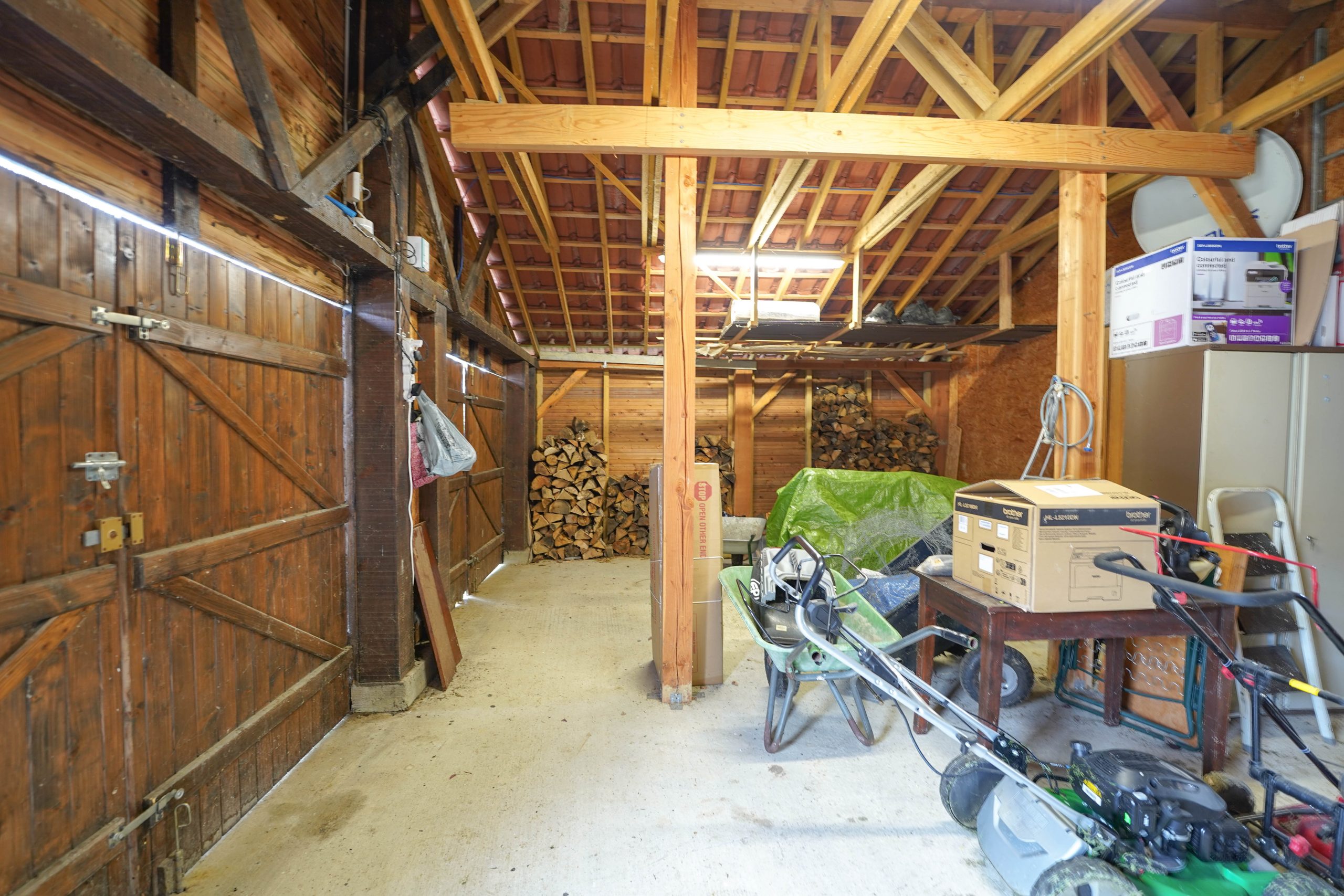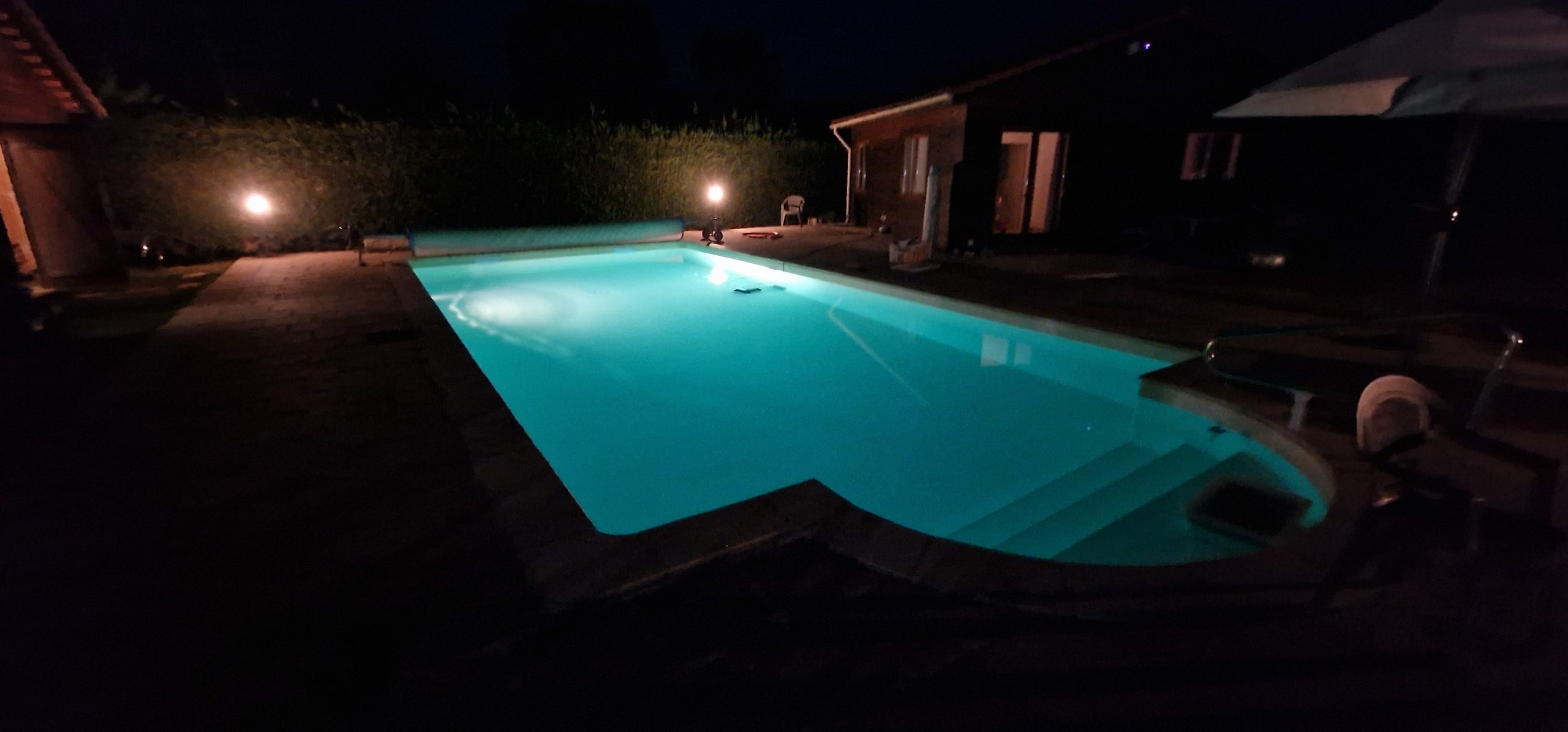 The garden extends to just over an acre and completely wraps around the property. It is flat and mainly laid to lawn with flower beds, shrubs and trees. The 12×6 metre salt water pool is heated and very private. It has recently been refurbished, including a new liner. The tiled surround is perfect for sunbathing. The entire garden is fenced, electric gates open into a spacious driveway with parking for several vehicles. A large double garage (60m2) and a workshop offer plenty of storage for garden and pool furniture. Two large covered terraces are perfect for alfresco dining for each house.