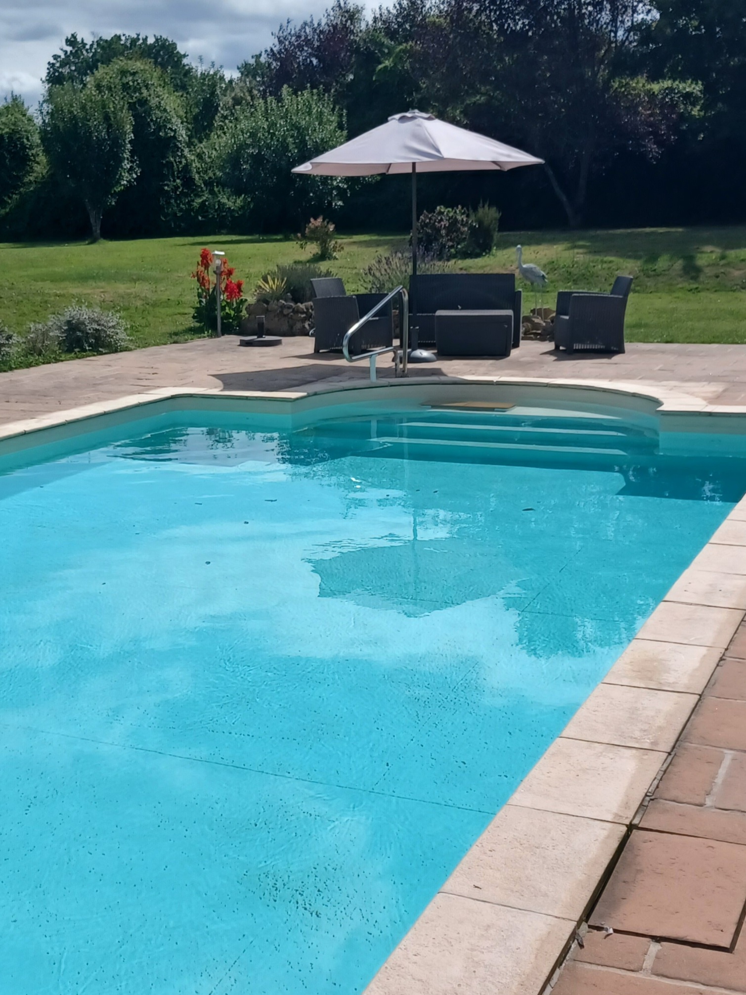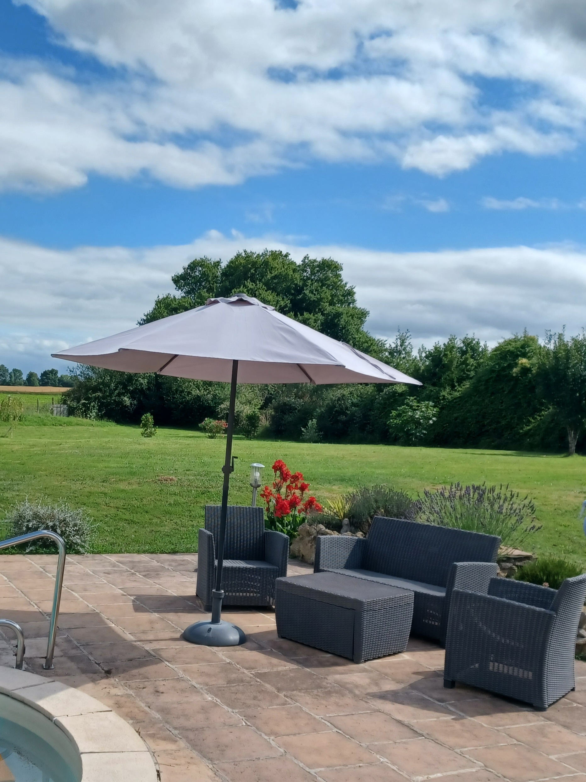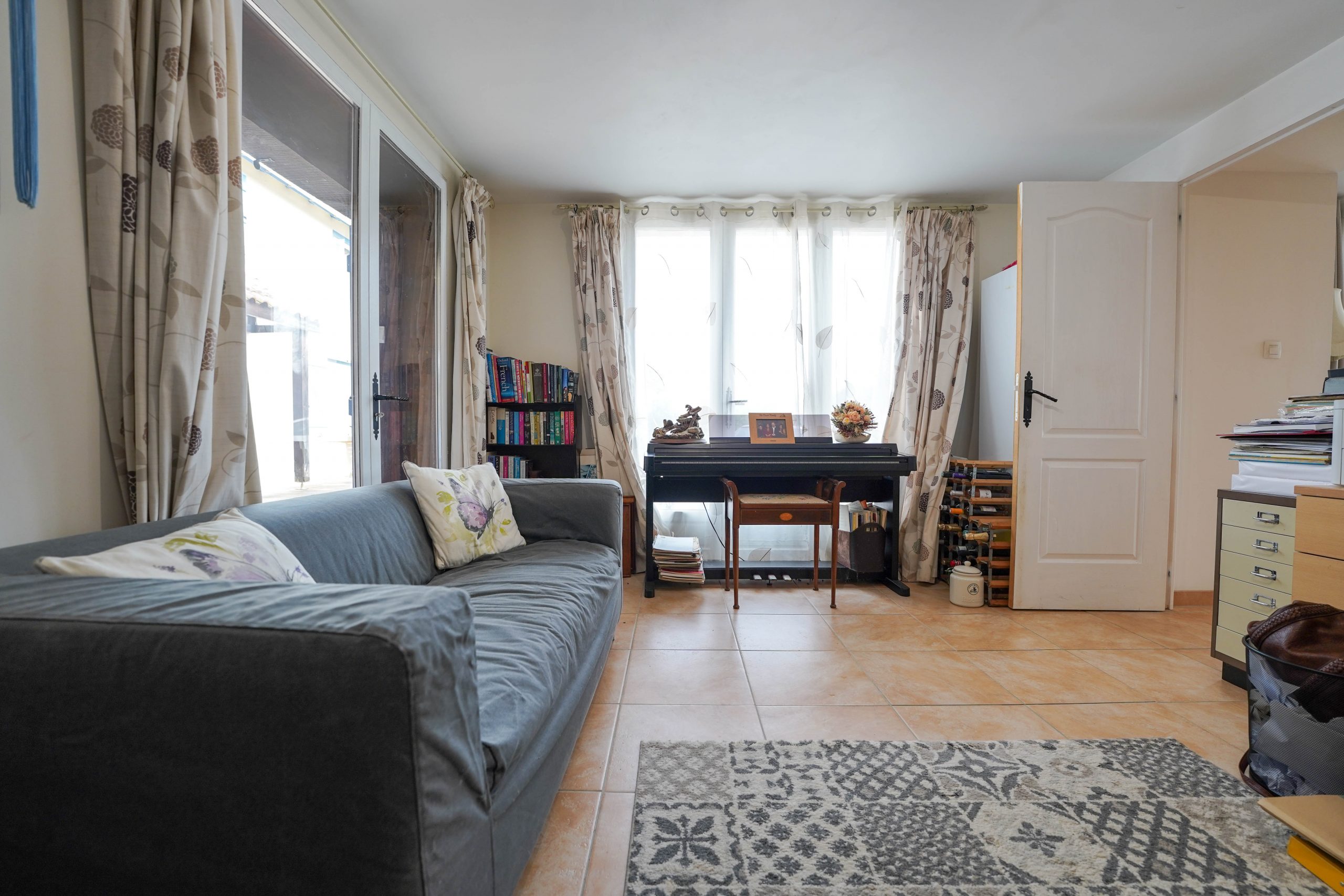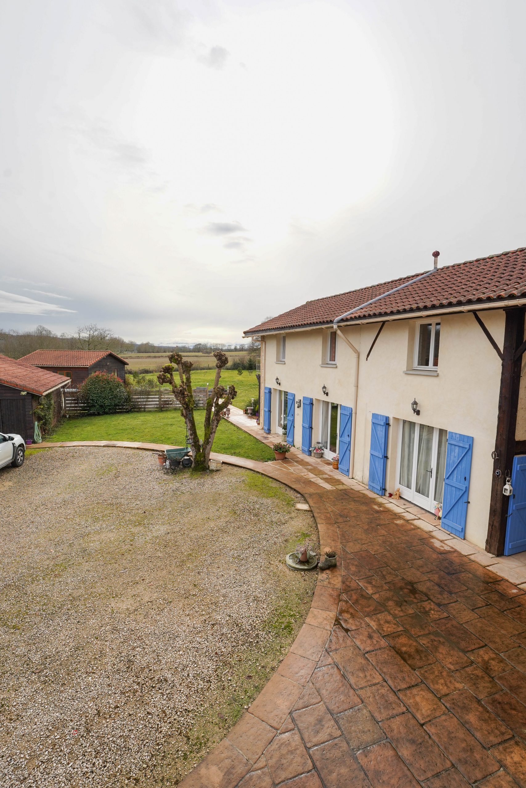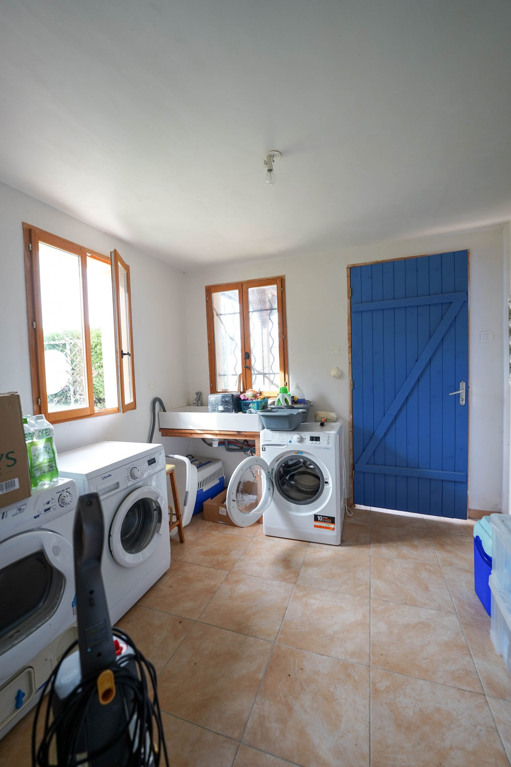 The garden extends to just over an acre and completely wraps around the property. It is flat and mainly laid to lawn with flower beds, shrubs and trees. The 12×6 metre salt water pool is heated and very private. It has recently been refurbished, including a new liner. The tiled surround is perfect for sunbathing. The entire garden is fenced, electric gates open into a spacious driveway with parking for several vehicles. A large double garage (60m2) and a workshop offer plenty of storage for garden and pool furniture. Two large covered terraces are perfect for alfresco dining for each house.