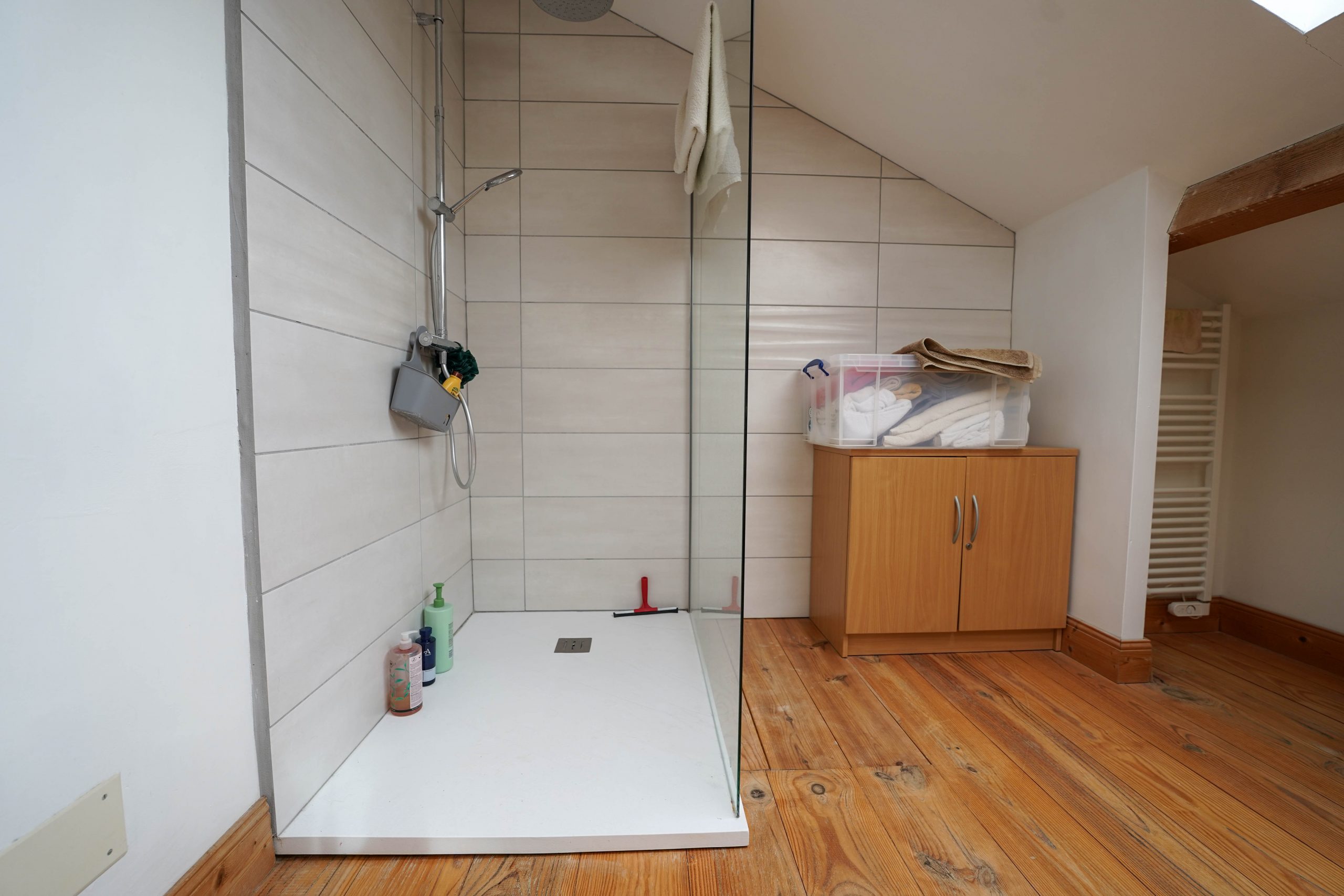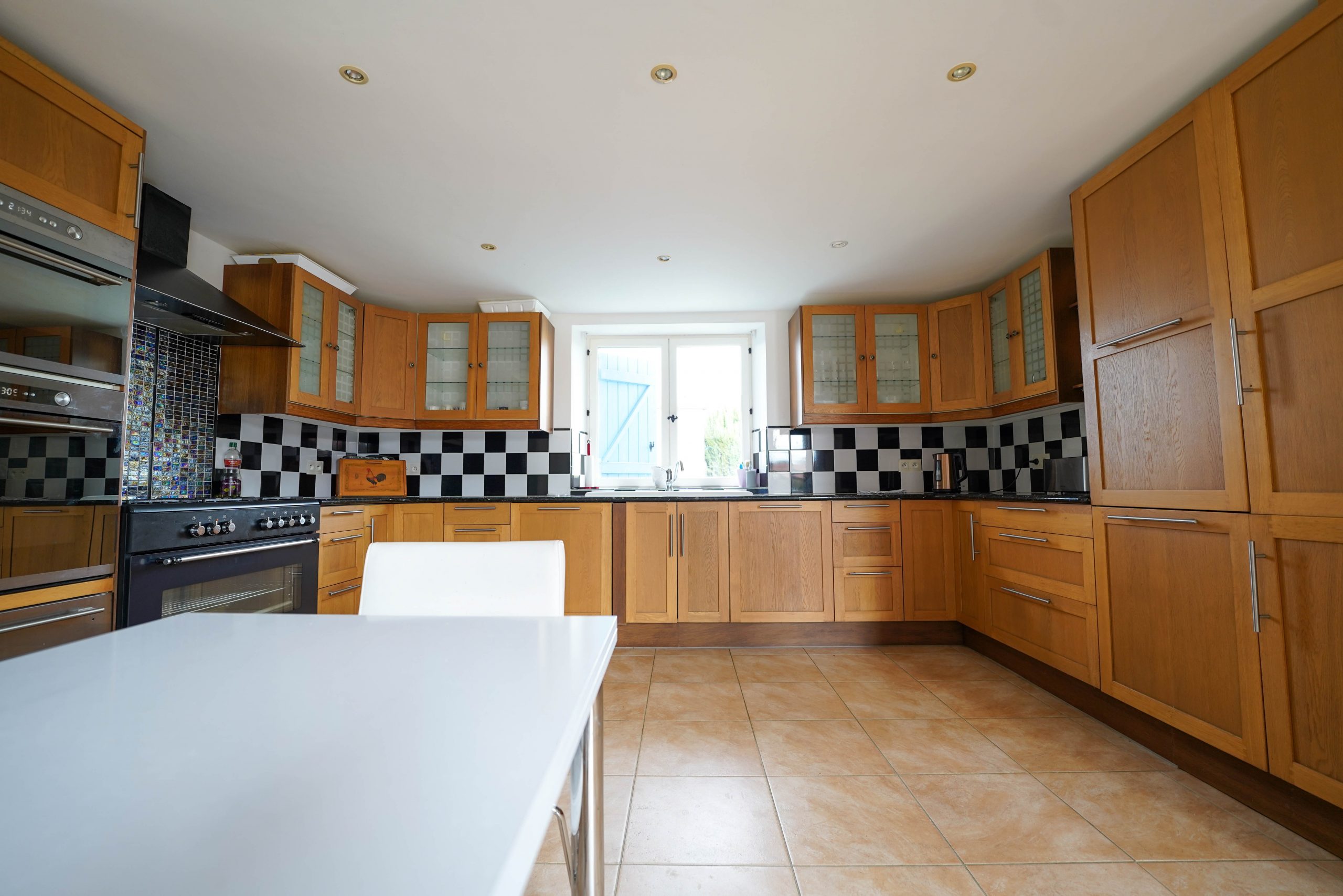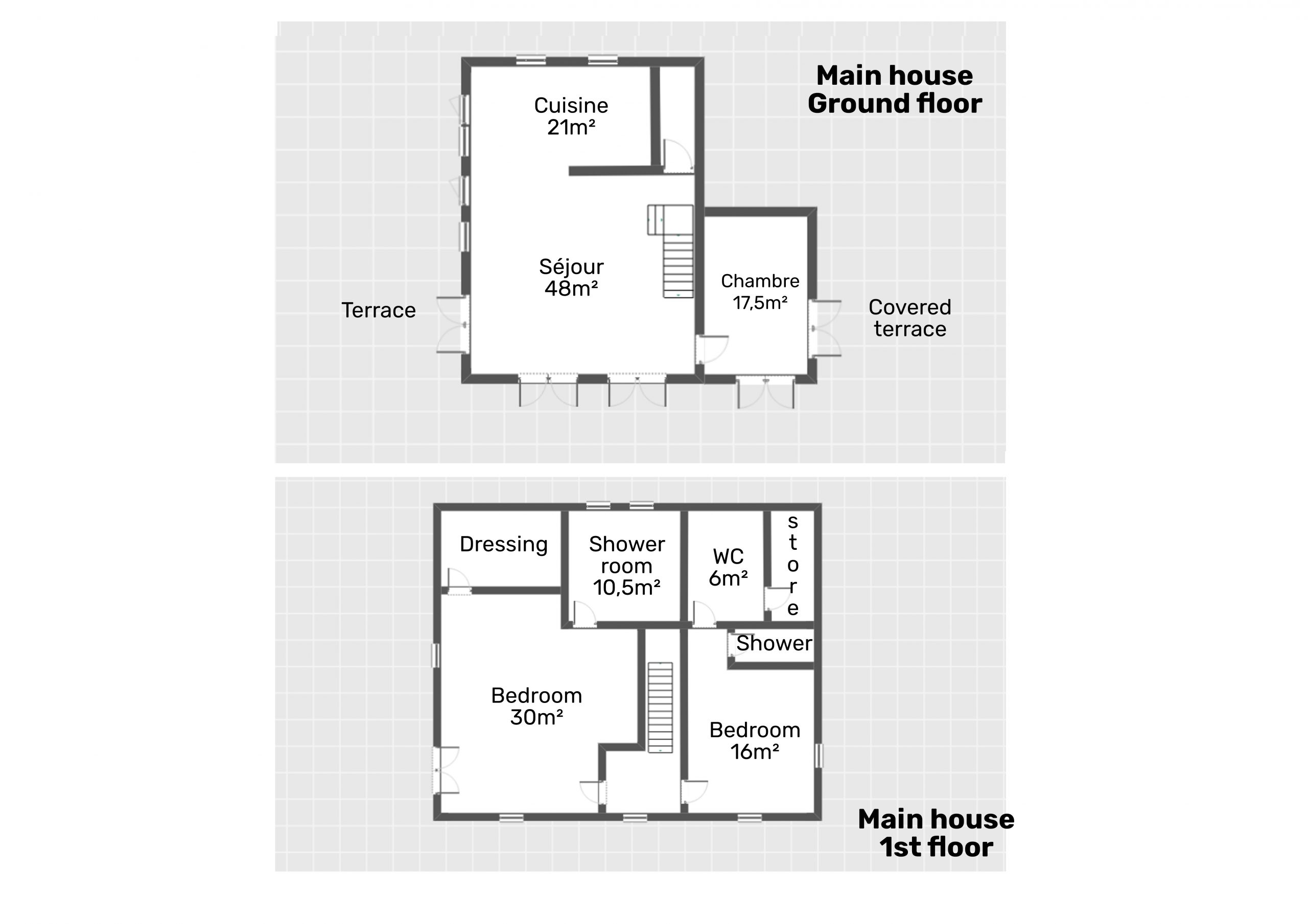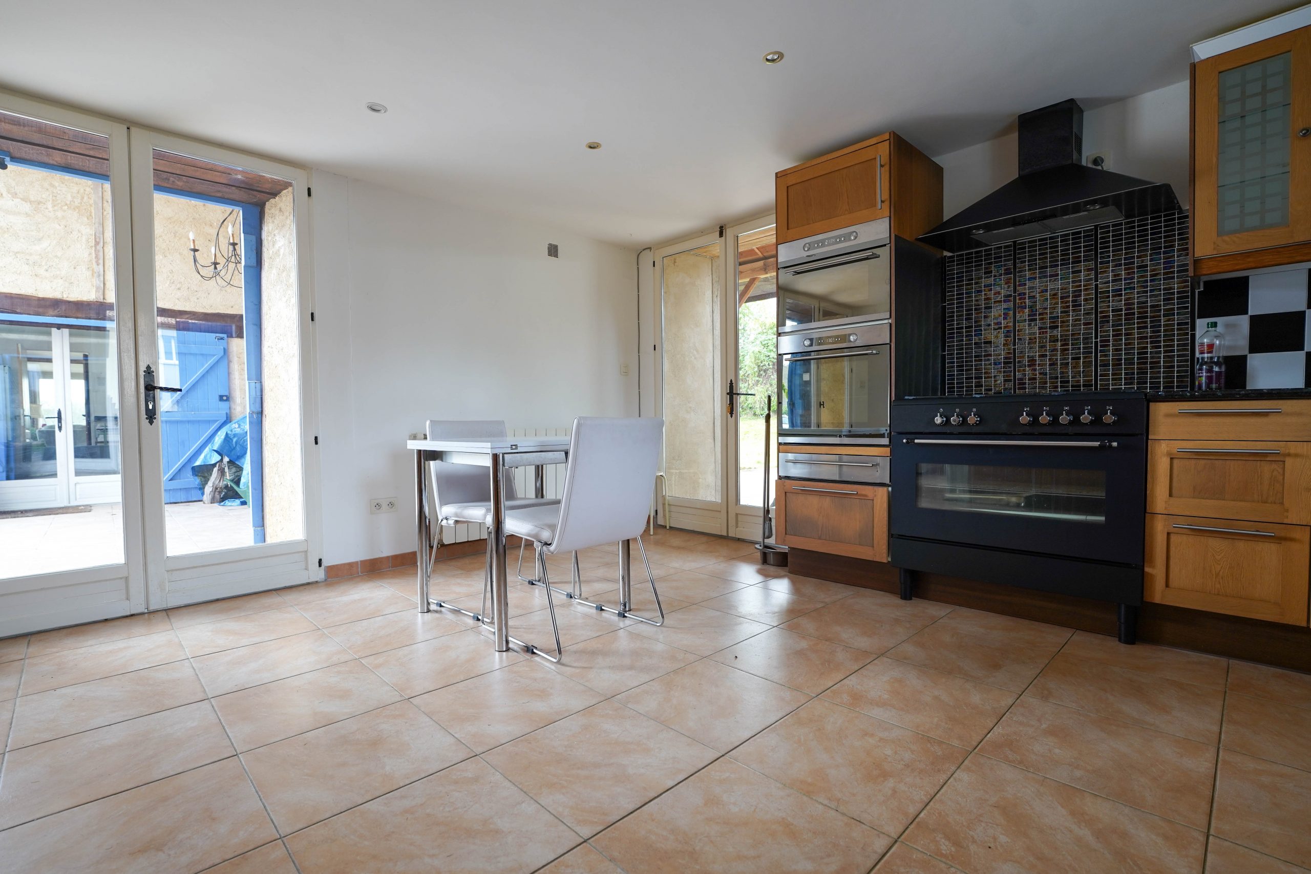 The main house (former barn) offers a large and very bright open plan living space with 3 sets of French doors opening onto the gardens and terraces. A recently fitted Hacker kitchen has a range cooker (gas hob and electric oven),  integrated fridge, wine cooler and dishwasher. It is separated from the large living room by a half wall. Also on the ground floor is a bedroom (currently used as an office), with French doors leading out to a large covered terrace. A shower room with w/c and washbasin completes the ground floor accommodation.
