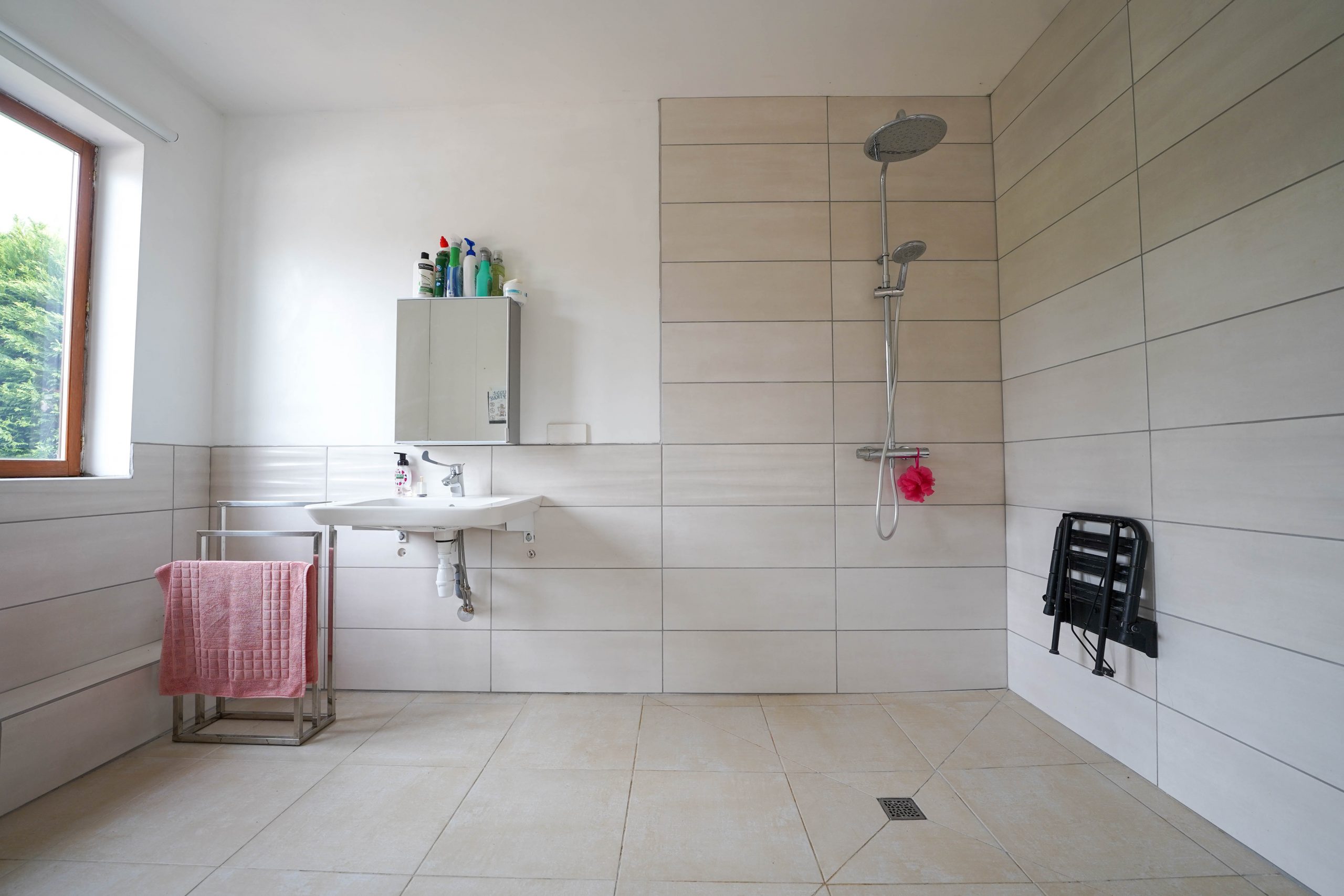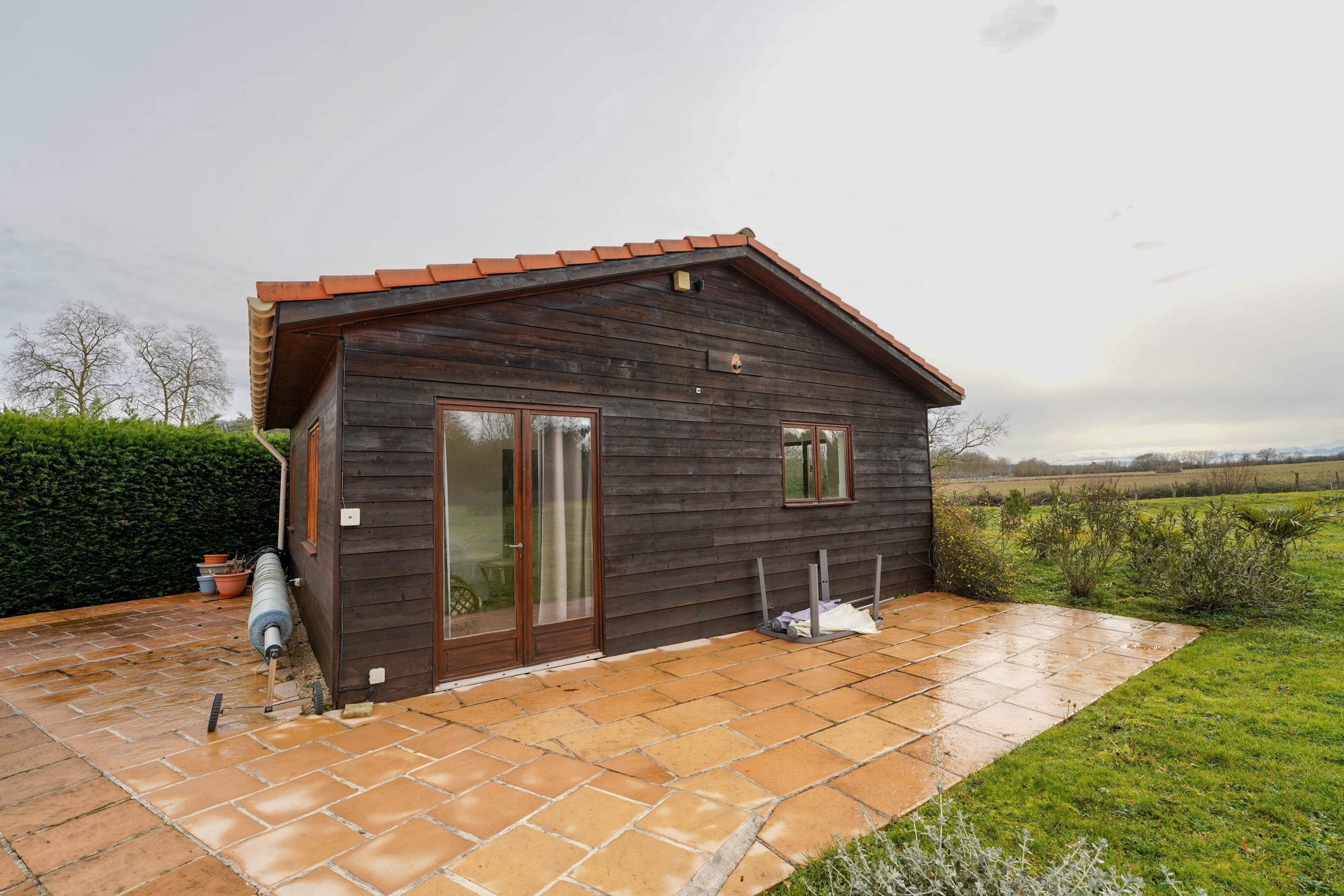 The chalet (49m2) is situated in the garden next to the pool. It has been completely adapted to accommodate a wheelchair user. An open plan living area with fitted kitchen gives on to a large double bedroom and a wet room with wheelchair height wash basin and W/C. Ideal for a relative with reduced mobility or as a holiday let.